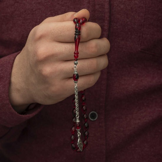 Kehribar, çam ağacı reçinesinin toprak altında uzun yıllar boyunca birikerek oluşan bir maddedir. Hemen hemen taş ile aynı sertliktedir fakat yoğunluğu düşüktür. Çam kokusu yayar. Oluşumu uzun zaman aldığından ve yapay olarak yapılamadığından değerli bir maddedir. Sıkma kehribar ise kehribar taşından farklı olarak onun özelliklerini taşıyan, görüntü itibariyle ona benzeyen fakat gerçek olmayan bir malzemedir. Ülkemizde ve dünyanın bir çok yerinde kehribar taşından çeşitli malzemeler üretilmiştir. Ülkemizde en yaygın olarak tesbih üretilmektedir. Kehribar tesbihler elde ısındıkça kehribar benzeri bir koku verir ve renk değiştirir. Bir çok rengi vardır. Hatta iki rengin birleşiminden oluşan kehribar tesbih modelleri de vardır. Genellikle gümüş püskül ile kullanılır veya sistemli olarak da kullanılabilir. Ülkemizin güzide tesbih ustaları bu malzemeyi sıklıkla işlemek suretiyle çeşitli sanat eserleri meydana getirirler. Bu tesbihler de koleksiyonerler tarafından alınıp satılmaktadır. Gümüş ay yıldız püsküllü arpa sıkma kehribar tesbih modeli de günlük hayatta kullanılabilecek çok şık bir tesbih çeşididir. Özel günlerin vazgeçilmez hediyesi sıkma kehribar tesbihler erkekler için doğum günü, sevgililer günü ve babalar günü gibi özel zamanlarda hediye olarak tercih edilebilir. Gümüş ay yıldız püsküllü arpa sıkma kehribar tesbih modeli diğer kehribar tesbih modellerinde olduğu gibi tamamen el emeği ile imal edilmiştir.